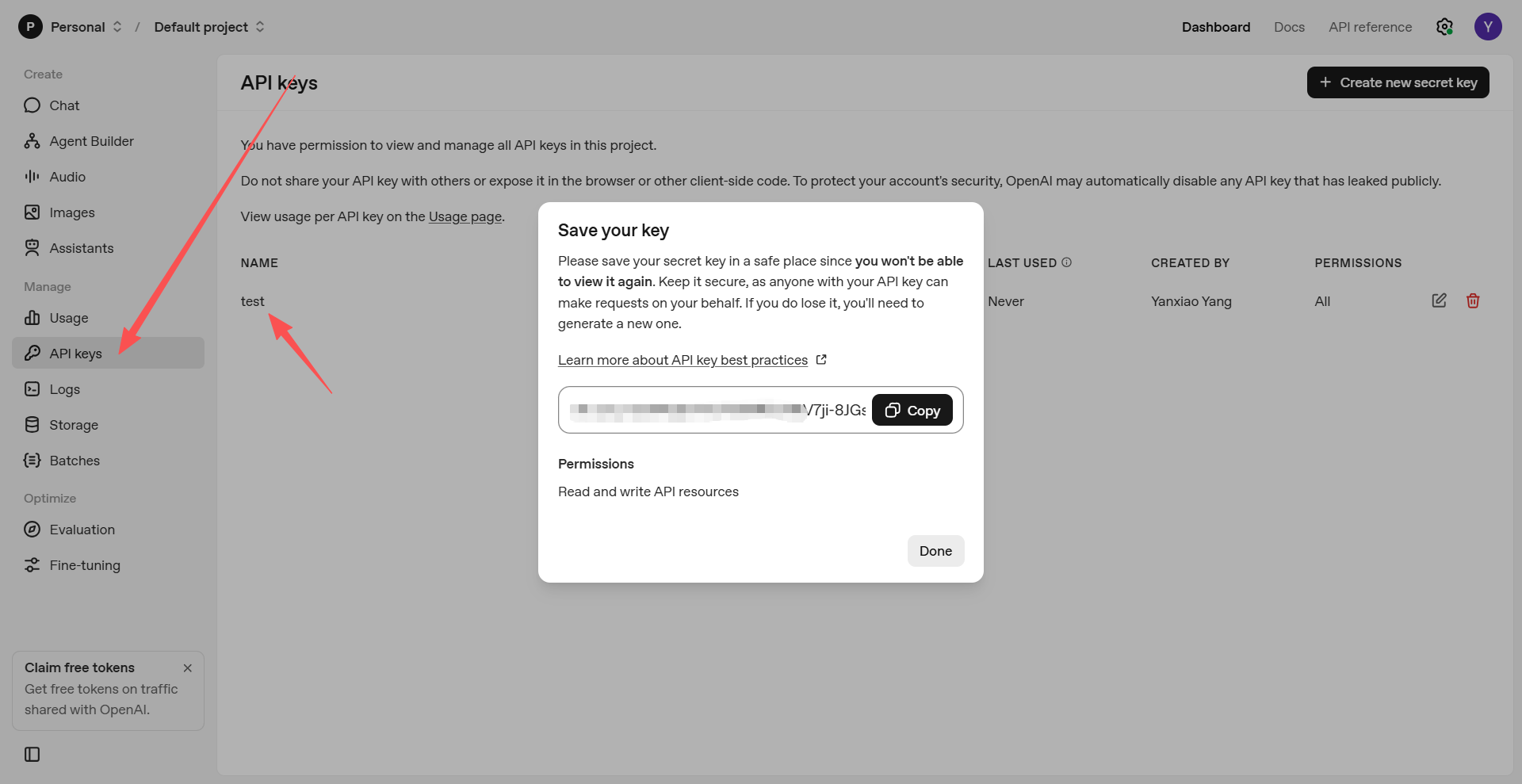 生成后会显示类似:sk-XXXXXXXXXXXXXXXXXXXXXXXXXXXXXXXXXXXXXXXX⚠️ 注意:只会显示一次,请立刻复制保存(放进你的